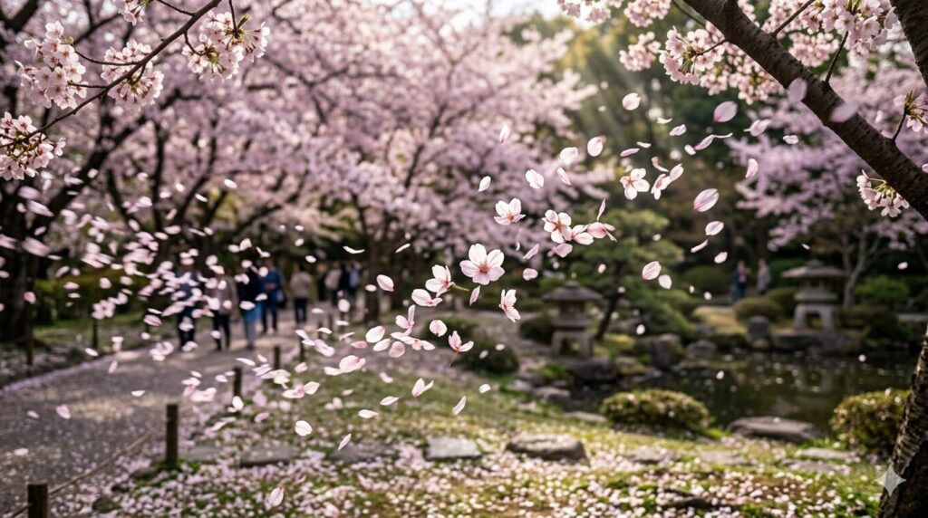Por isso, quando as flores começam a cair, é comum ver pétalas sendo levadas pelo vento, criando um verdadeiro “tapete rosa” nos parques. Esse fenômeno é chamado de “sakura fubuki”, ou tempestade de pétalas.